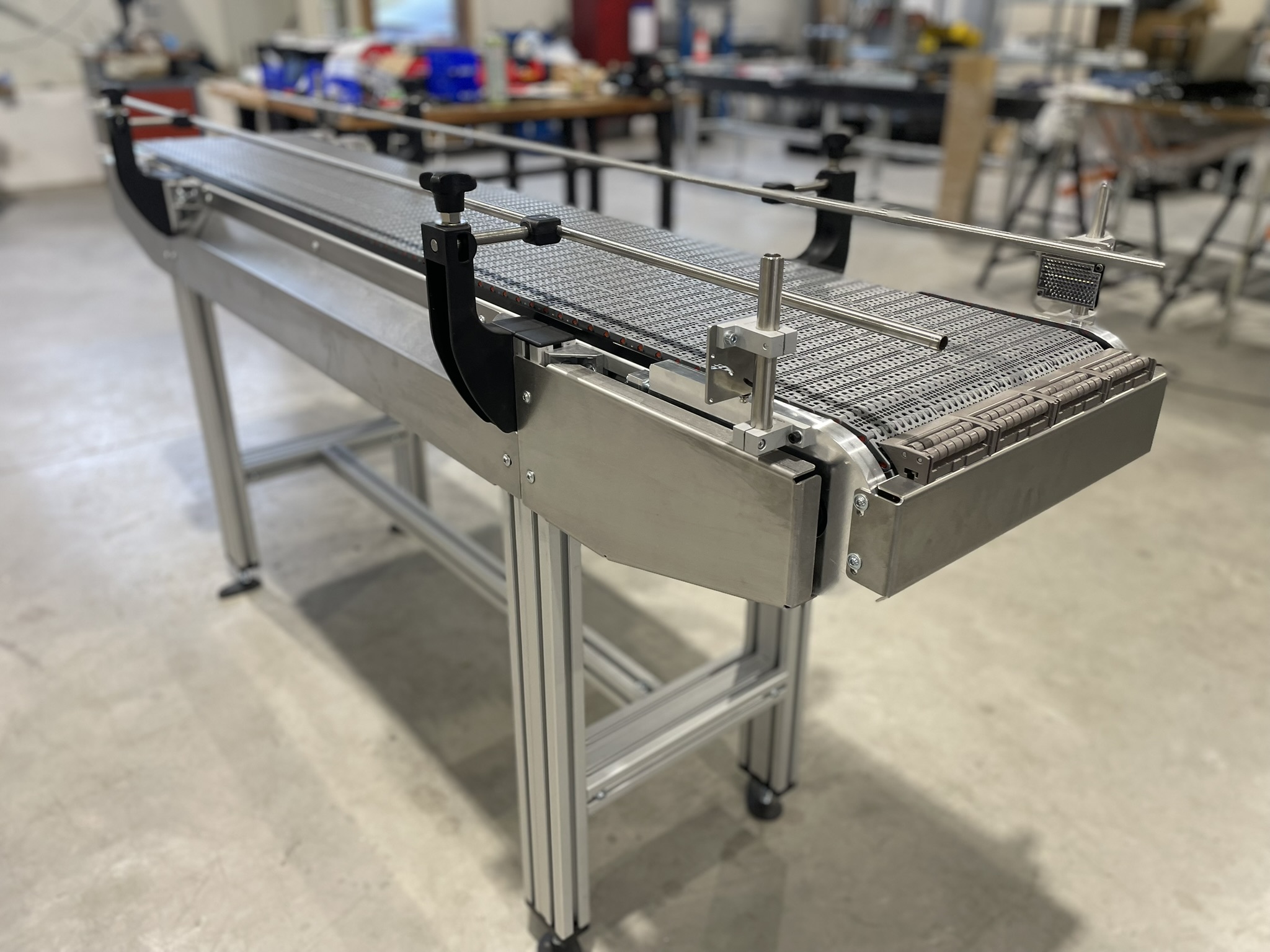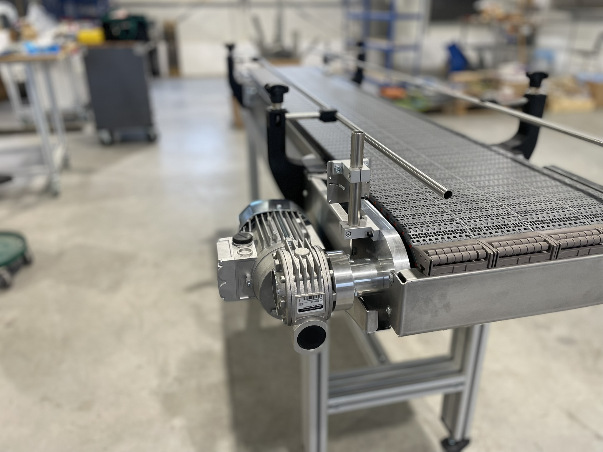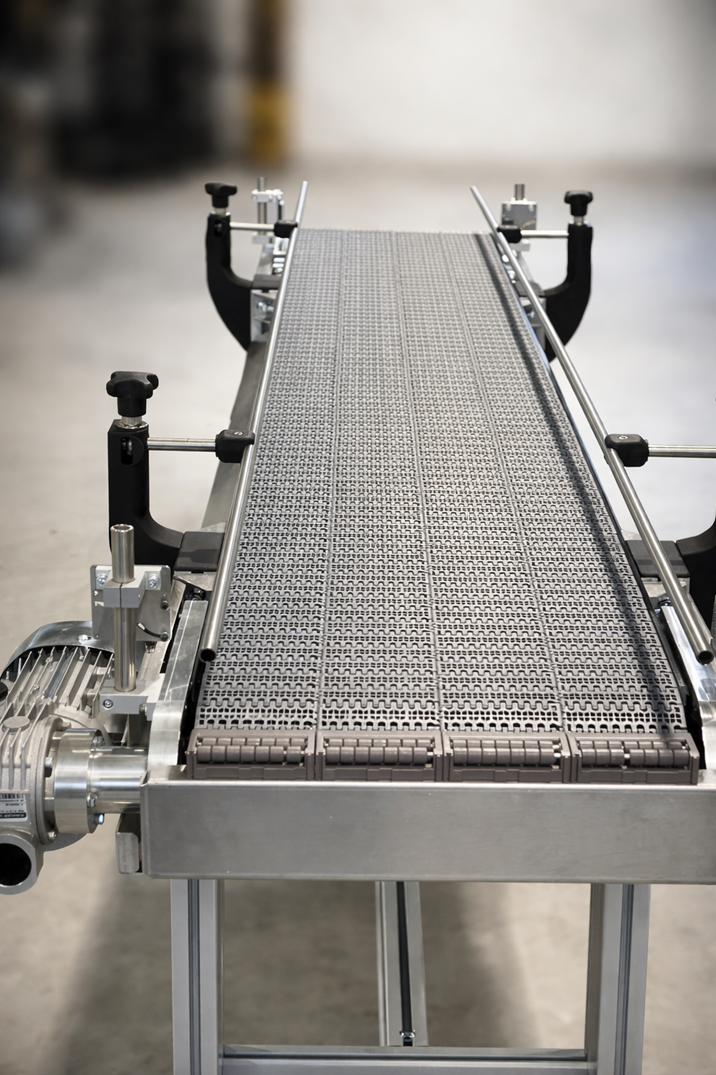 Csigahajtóműves motorral, oldalterelőkkel ellátott pályát korrózióálló acél vázzal és alumínium lábakkal építettünk. A pálya elérhető különböző szélességi és hosszúsági méretekben, porfestett acél és korrózióálló acél változatokban is.